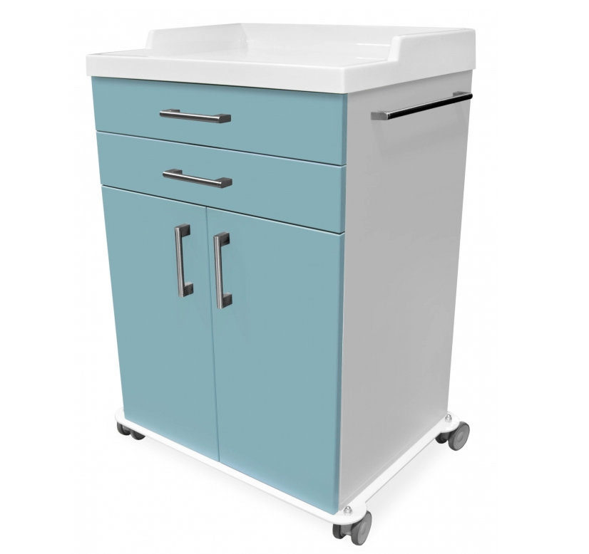 Całość pokryta jest okleiną PCV. Wózek osadzony jest na stalowej podstawie wyposażanej w kółka jezdne z hamulcem.