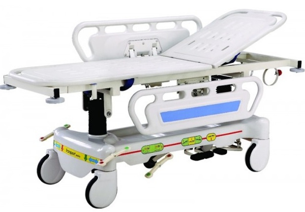 Wyposażenie standardowe (w cenie): materac w pokrowcu nieprzemakalnym typu skaj o grubości 80mm, barierki boczne tworzywowe z ABS – opuszczane pod leże wózka, wieszak kroplówki, uchwyt na butlę tlenową.