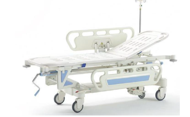Wyposażenie standardowe (w cenie): materac w pokrowcu nieprzemakalnym typu skaj o grubości 80mm, barierki boczne tworzywowe z ABS – opuszczane pod leże wózka, wieszak kroplówki, uchwyt na butlę tlenową.