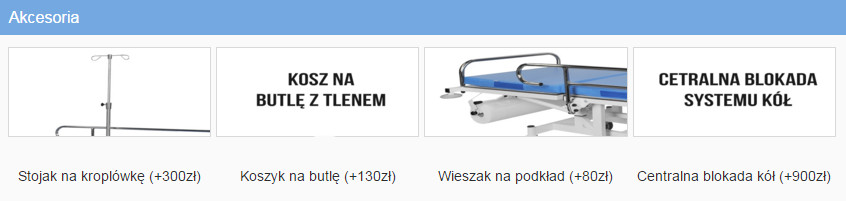 Wózek wykonany jest ze stalowych profili oraz blatu pokrytego tapicerką. Wózek posiada opuszczane barierki boczne, płytę HPL przezierną dla promieni RTG, hydrauliczną regulację wysokości, kółka jezdne, odbijaki oraz w opcjach dodatkowych kółka z centralną blokadą, obudowę maskująca podstawę wózka z półką na ubrania pacjenta, koszyk na butlę z tlenem, składany wysięgnik do kroplówki, uchwyt na rolkę z podkładem oraz koszyk na ubrania pacjenta.
