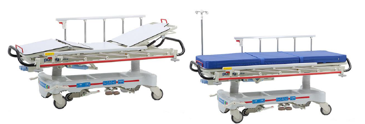 Wyposażenie standardowe (w cenie): materac w pokrowcu nieprzemakalnym typu skaj o grubości 80mm, barierki boczne aluminiowe – składane, wieszak kroplówki, prowadnica na kasetę RTG