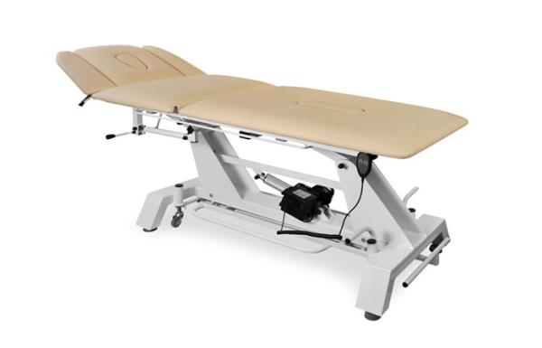 Stacjonarny stół do rehabilitacji KSR charakteryzuje się smukłym i nowoczesnym designem. Stół KSR F to trzyczęściowy model stołu rehabilitacyjnego z ręczną regulacją wysokości. Regulacja tylnej części leża w zakresie do 70 stopni pozwala na ułożenie stołu w pozycji fotela. Dodatkowo stół posiada dwa otwory znajdujące się w części leża oraz w podgłówku. Obicie stołu wykonane jest z materiału skóropodobnego o wysokich parametrach wytrzymałościowych, dostępnego w szerokiej gamie kolorystycznej.