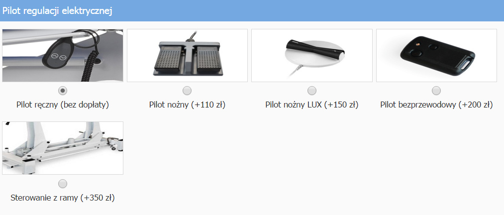 Stół może być wyposażony w pilot nożny, sterownie z ramy oraz system jezdny (opcje dodatkowe za dopłatą).