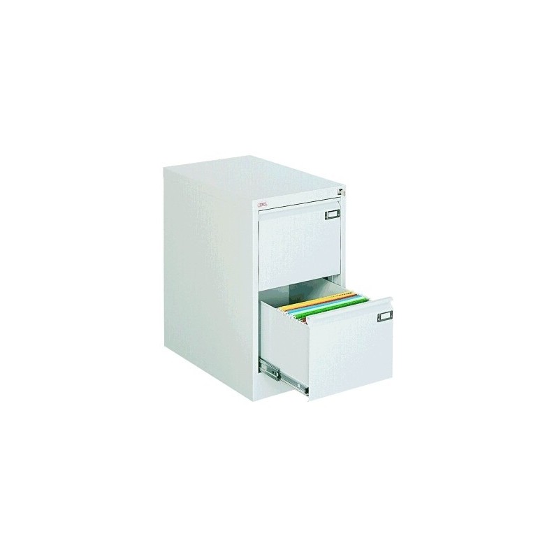 2 szufladowa szafka kartotekowa na teczki zawieszkowe. Korpus metalowej szafy kartotekowe i fronty szuflad wykonane z blachy stalowej, wieniec dolny dodatkowo zabezpieczony z blachy ocynkowanej. Metalowa szuflada przystosowana do teczek zawieszkowych (format A4 poziomo) na prowadnicach kulkowych o pełnym wysuwie, z zabezpieczeniem przed wypadaniem. Centralne ryglowanie metalowych szuflad.
