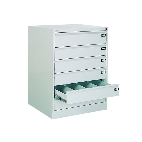 6 szufladowaszafka krtoteczna . Korpus metalowej szafy kartotekowej i fornty szuflad wykonane z blachy stalowej, wieniec dolny z blachy ocynkowanej. Szuflada przystosowana na cztery rzędy kartotek o formacie A6 poziomo na prowadnicach kulkowych o podwójnym wysuwie, z zabezpieczeniem przed wypadaniem. Centralne ryglowanie szuflad.