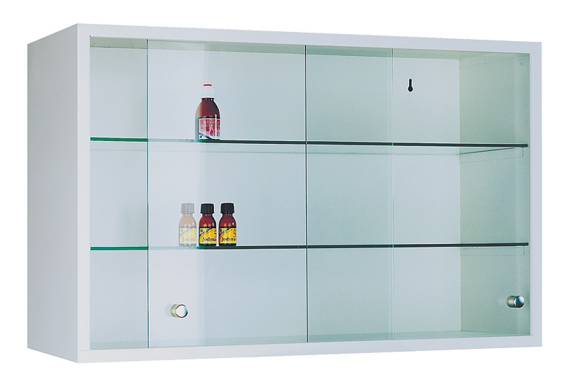Metalowa Szafka wisząca z drzwiami przesuwnymi. Drzwi i półki wykonane ze szkła.