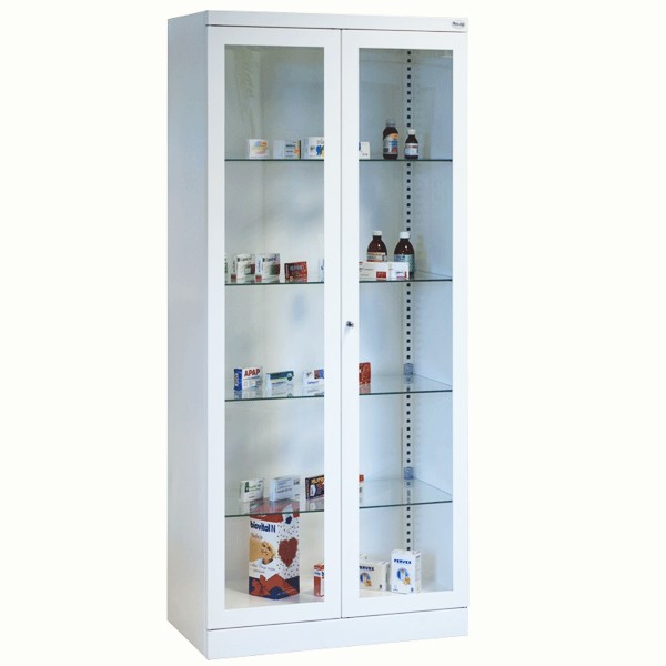 Szafa Metalowa lekarska jest elegancka i funkcjonalna. Trwała i estetyczna. Korpus szafy metalowej medycznej wykonany z blachy gr. 0,8 mm. Drzwi Szafy Metalowej lekarskiej przeszklone, półki wykonane ze szkła (tzw. bezpieczne). Półki w szafie lekarskiej przestawne co 25 mm. Uchwyt drzwiowy z zamkiem zabezpieczającym ryglującym drzwi w dwóch punktach.