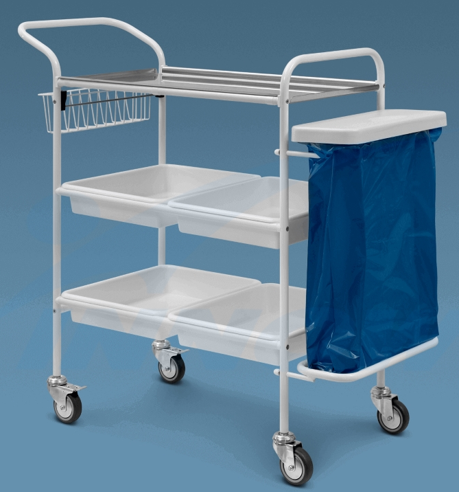 Wózek oddziałowy o konstrukcji metalowej pokrywanej proszkowo.Posiada wyjmowane pojemniki wykonane z tworzywa, umieszczony z boku foliowy worek z pokrywą, kosz, nierdzewną tacę (wyjmowana) oraz 4 kółka (2 posiadają blokadę).