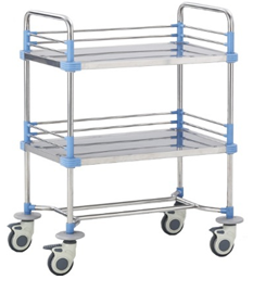 Konstrukcja wózka wykonana z chromowanych rur stalowych, osłonki z tworzywa ABS, blaty wykonane ze stali nierdzewnej. Wózek posiada dwa blaty, oba z trzech stron posiadające relingi zabezpieczające przed zsuwaniem się przedmiotów z blatów podczas przemieszczania się wózka zabiegowego. Stolik wyposażony w 4 koła o średnicy 100mm, każde z blokadą indywidualną.