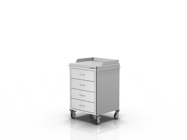 Wózek zabiegowy z czterema szufladami zamontowanymi na prowadnicach samodomykających. Wózek posiada kółka o średnicy 100 mm (dwa z blokadą) z oponkami wykonanymi z tworzywa sztucznego, niebrudzącego podłoża. Przy kołach znajdują się odbojniki chroniące wózek przed zniszczeniem. Uchwyt do prowadzenia umieszczony został z przodu wózka.