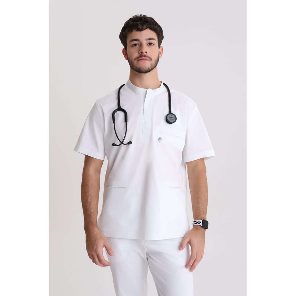 Elegancka męska bluza medyczna zaprojektowana z myślą o nowoczesnych profesjonalistach. Prosty, klasyczny krój zapewnia swobodę ruchów i schludny wygląd, idealny do codziennej pracy w środowisku medycznym. Model wyróżnia się dekoltem ze stójką, zapinanym na praktyczne napy, które ułatwiają zakładanie bluzy i podkreślają jej nowoczesny, uporządkowany charakter. Bluza została wyposażona w trzy kryte kieszenie — jedną na piersi oraz dwie po bokach — zaprojektowane tak, aby pozostać dyskretnymi, a jednocześnie funkcjonalnymi. Uszyta z miękkiej, przewiewnej tkaniny zawierającej 98% bawełny i 2% elastanu, dzięki czemu jest lekko elastyczna, dobrze dopasowuje się do sylwetki i umożliwia swobodę ruchów, nawet przy bardziej wymagających zadaniach.