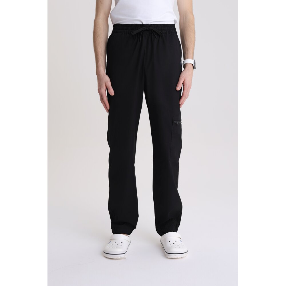 Nowoczesne męskie spodnie medyczne typu jogger, zaprojektowane z myślą o maksymalnej wygodzie i dynamicznym trybie pracy. Spodnie uszyte zostały z wysokiej jakości, oddychającego materiału: 98% bawełna, 2% elastan – tkanina jest miękka, przyjemna w dotyku i lekko elastyczna, dzięki czemu zapewnia komfort i swobodę ruchów przez cały dzień pracy. Delikatnie zwężany krój oraz gumki przy kostkach zapewniają dobre dopasowanie i nowoczesny wygląd, bez ograniczania swobody ruchów. Model wyposażony jest w praktyczne kieszenie cargo z przodu i z tyłu, które oferują dużą pojemność i szybki dostęp do niezbędnych akcesoriów. Dodatkowa kieszeń na udzie zapinana na suwak zwiększa funkcjonalność i bezpieczeństwo przechowywanych drobiazgów, takich jak telefon czy klucze. Połączenie sportowego charakteru z medyczną funkcjonalnością sprawia, że spodnie doskonale sprawdzają się podczas intensywnego dnia pracy, zapewniając komfort i profesjonalny wygląd.