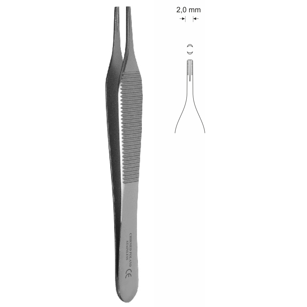 Wysokiej jakości precyzyjna pinceta chirurgiczna wykonana z niemieckiej stali nierdzewnej. Wysoka jakość wykonania oraz wykorzystane materiały gwarantują funkcjonalność, wytrzymałość oraz wysoką odporność na korozję w warunkach użytkowania, dezynfekcji i sterylizacji. Pinceta przydatna do chwytania powięzi, podskórnej tkanki tłuszczowej oraz ścięgien. Na czubkach znajdują się dwa podłużne rzędy drobnych ząbków gwarantujące pewny uchwyt delikatnych tkanek bez ryzyka ich uszkodzenia. Produkt przeznaczony do wielokrotnego użytku po uprzednim myciu, dezynfekcji i sterylizacji.