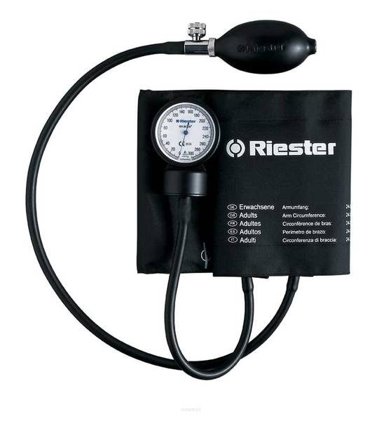Ciśnieniomierz zegarowy Exacta to wysokiej jakości ciśnieniomierz lekarski firmy Riester. Zaopatrzony w dwa przewody z możliwością zamocowania manometru bezpośrednio do mankietu - takie rozwiązanie znacznie ułatwia wykonanie pomiaru. Mocowanie manometru wykonano z wytrzymałego metalu, sam manometr natomiast charakteryzuje się niewielkimi wymiarami za czym idzie jego niewielka waga. Skala manometru wykonana jest w kontrastowych kolorach co powoduje, że mimo niewielkich wymiarów, jest ona bardzo czytelna. Ciśnieniomierz zawiera w zestawie mankiet na rzepy dla dorosłych.
