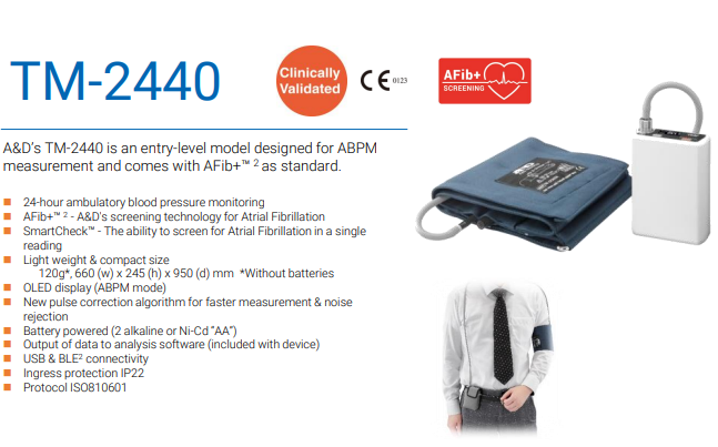 Holter ciśnienia TM 2430 jest kompaktowym i lekkim ambulatoryjnym ciśnieniomierzem krwi wcielającym w życie najnowszą technologie uzyskaną podczas 20 letniej produkcji ciśnieniomierzy ambulatoryjnych. Algorytm pomiarowy urządzenia został sprawdzony klinicznie przez Brytyjskie Towarzystwo Nadciśnienia Tętniczego i uzyskał najwyższą możliwą klasę dokładności A/A. Ważący tylko 215 gramów, ciśnieniomierz może być noszony przez pacjentów przez całą dobę. Zapamiętuje 300 pomiarów i współpracuje z programem do analizy wyników Doctor Pro.