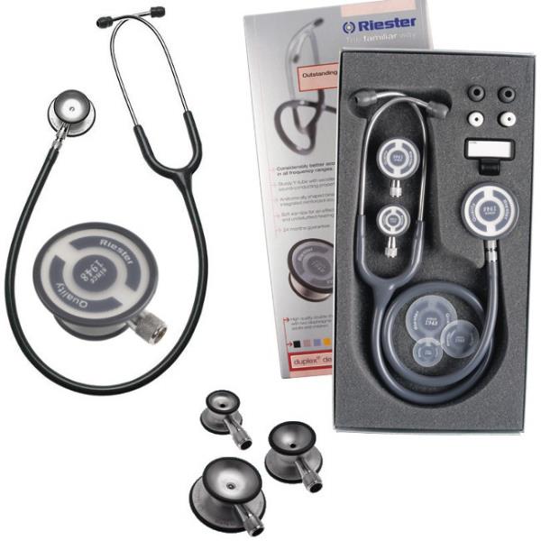 Stetoskopy niemieckiej marki Riester - Tristar z trzema dwustronnymi głowicami duplex®, duplex® baby (dziecięcy) oraz duplex® neonatal (noworodkowy) wykonane są z aluminium z praktyczną szybkozłączką która umożliwi szybka wymianę głowic. Wyposażony w specjalnie utwardzane trzy membrany Ø 48 mm, 36 mm, 28 mm oraz trzy lejki o długościach Ø 36 mm, 28 mm, 24 mm. Osiąga znakomite parametry akustyczne we wszystkich obszarach zastosowań. Posiada wzmocniony dren wykonany z PVC dodatkowo tłumi zakłócenia i zapewnia lepszy osłuch pacjenta. Miękkie, wymienne oliwki doskonale uszczelniają tłumiąc zakłócenia oraz są bardzo wygodne w noszeniu. Stetoskop zaprojektowany i wyprodukowany w Niemczech. Dostępny kolorze szarym.