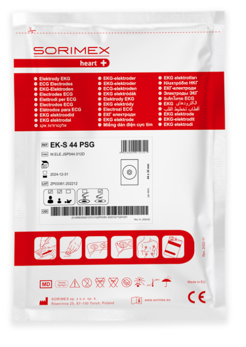 Elektrody EKG EK-S 44 PSG to wyrób medyczny jednorazowego użytku, niesterylny o wymiarach 44 x 30 mm; wykonane na bazie pianki polietylenowej z żelem stałym. Przeznaczone dla dzieci i dorosłych do badań krótkookresowych, spoczynkowych, ciągłego monitorowania i diagnostyki.