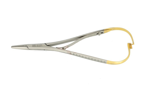 Igłotrzymacz Mathieu, prosty, o długości 14 cm. Wkładka utwardzana węglikiem spiekanym TC.