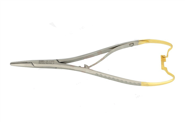 Igłotrzymacz Mathieu TC, prosty, o długości 14 cm. Wkładka utwardzana węglikiem spiekanym TC.