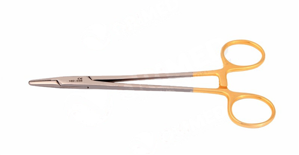 Igłotrzymacz Mayo-Hegar TC, prosty, dł. 13,5 cm. Wkładka utwardzana węglikiem spiekanym.