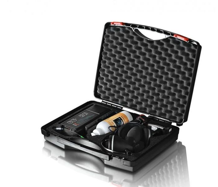 W komplecie znajduje się aparat, głowica, ładowarka akumulatora, żel oraz słuchawki – wszystko w poręcznej walizeczce.