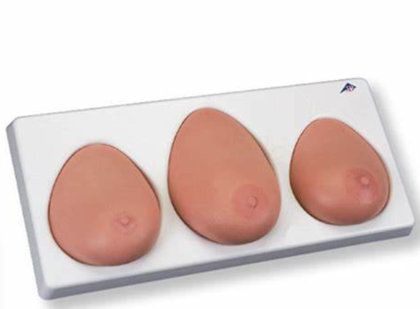 Model przedstawia trzy piersi na jednej podstawie, co pozwala na intuicyjne porównanie pomiędzy zdrową tkanką a różnymi przykładami zmian patologicznych.