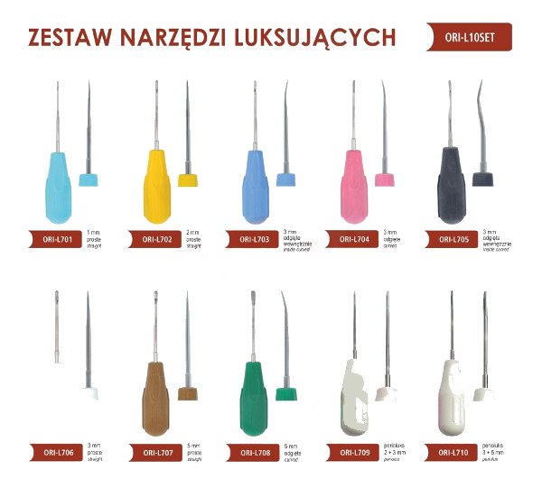 ORI-L701 - instrument luksujący prosty szerokość 1mm do korzeni zębów przednich i bocznych, żuchwy oraz szczęki, do głęboko złamanych korzeni, apeksów, bardzo atraumatyczny, przejmuje funkcje periotomu. UWAGA! Bez funkcji wyważania!