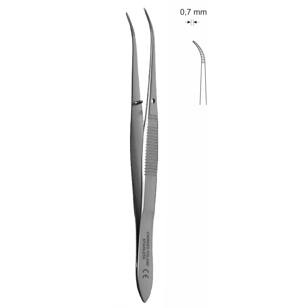Pinceta do tęczówki, anatomiczna, lekko odgięta, dł. 100 mm, czubek 0,7 mm.