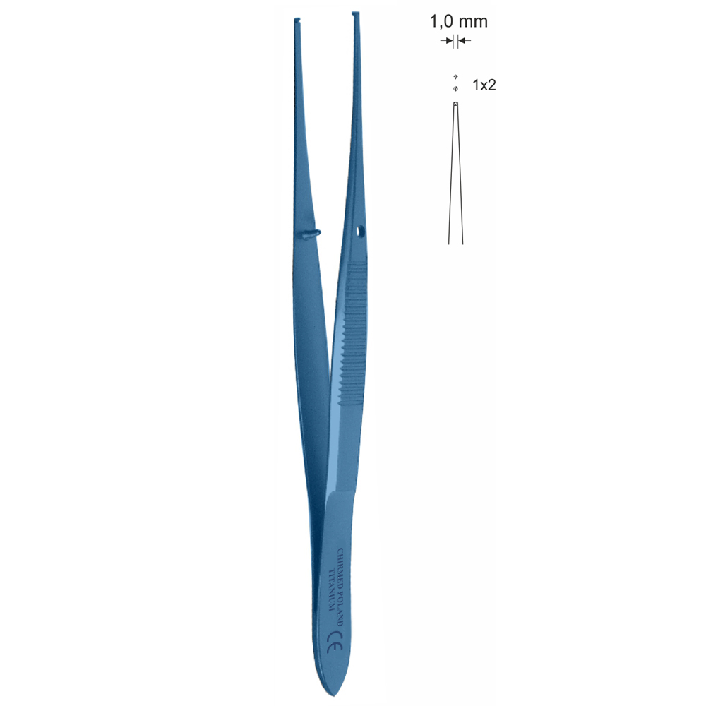 Pinceta do tęczówki prosta, wykonana z tytanu, dł. 100 mm, czubek 1mm, 1×2 ząbki.