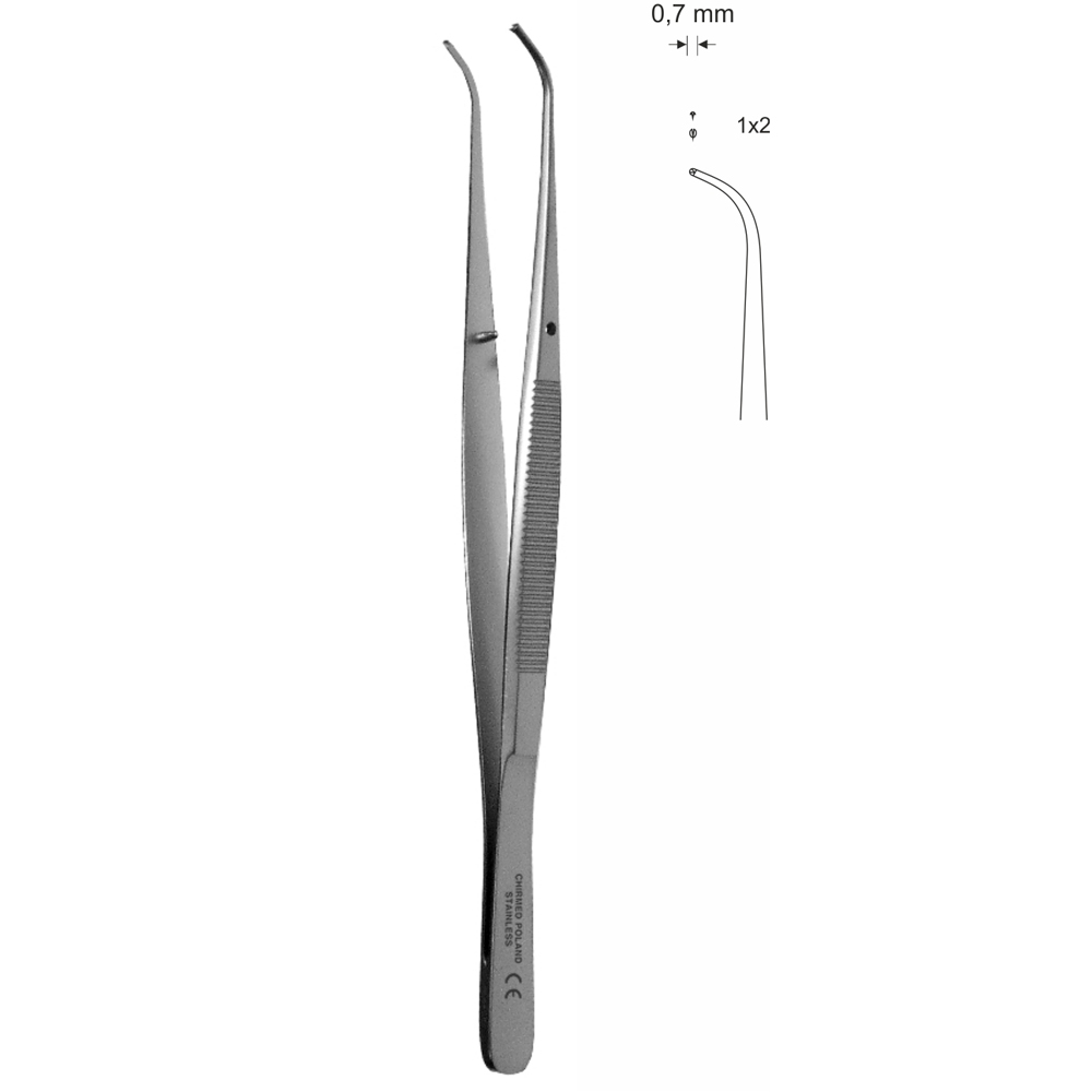 Pinceta okulistyczna, chirurgiczna, dł. 130 mm, czubek 0,7 mm, 1×2 ząbki, odgięta