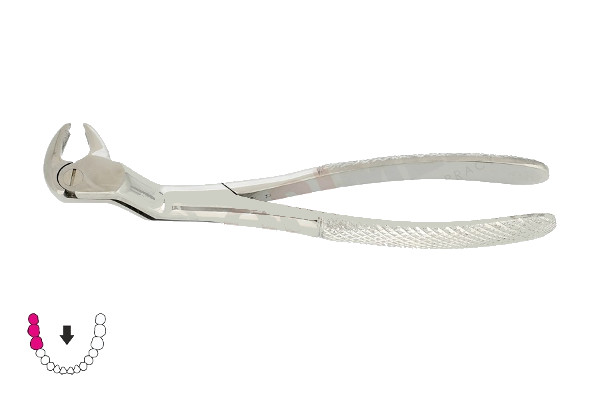 Kleszcze Routurier do ekstrakcji dolnych trzonowców i zębów mądrości. Specjalne wysięgniki pozwalają na łatwy dostęp do trudno dostępnych miejsc. W ofercie występują dwa warianty: prawe i lewe.