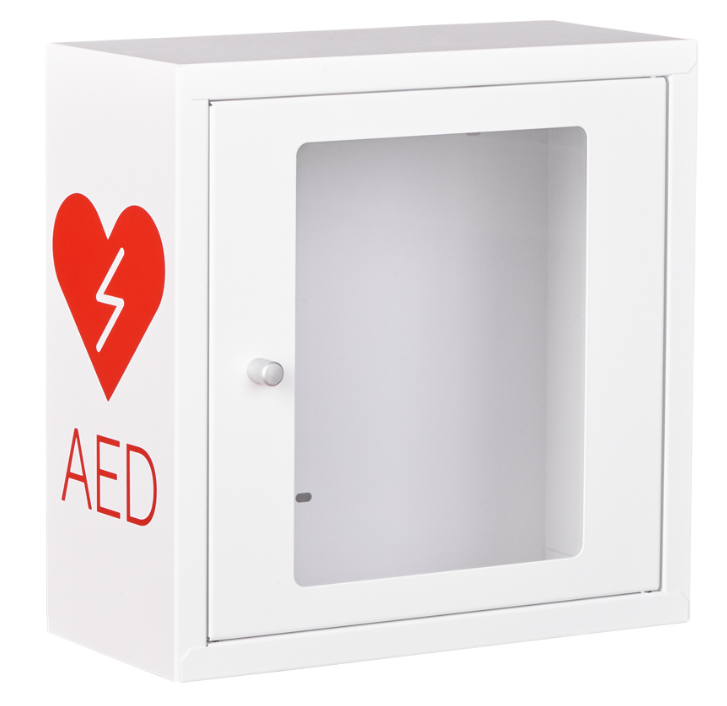 Metalowa szafka na defibrylator AED wykonana z solidnej blachy malowanej proszkowo w kolorze białym, która została dodatkowo wyposażona w alarm dźwiękowy, uruchamiany podczas otwarcia skrzynki przez użytkownika. Szafka posiada także system „zbij szybkę”, aby dostęp do defibrylatora był możliwy zawsze, gdy jest to konieczne. Na przednich drzwiczkach zainstalowano szybkę, która ułatwia kontrolę zawartości. Produkt kompatybilny jest z większością defibrylatorów AED dostępnych na rynku.