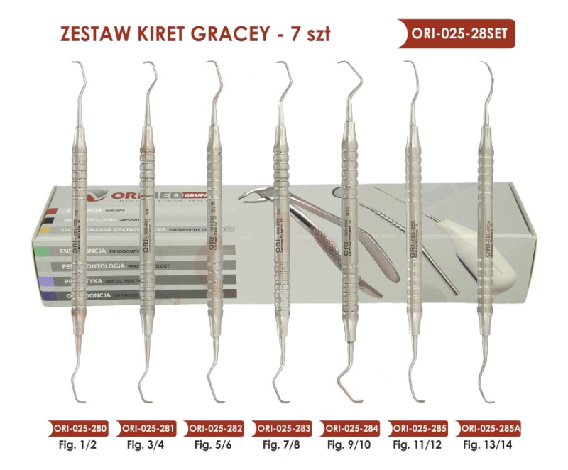 W zestawie znajduje się 7 różnych figur kiret Gracey z rączką ergonomiczną. W zestawie figury: 1/2, 3/4, 5/6, 7/8, 9/10, 11/12, 13/14