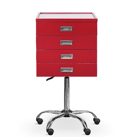 Mobilna szafka do gabinetu stomatologicznego wyposażona jest w 4 szuflady. Asystor stomatologiczny posiada chromowaną podstawę i szklane blaty, co ułatwia częstą dezynfekcję mebla. Szafka posiada możliwość regulacji wysokości.