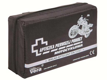 Apteczka motocyklowa w opakowaniu z tkaniny wodoodpornej.