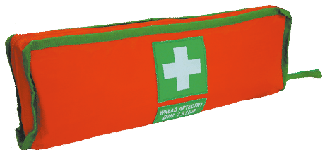 Apteczka standard w formie saszetki posiada podstawowy asortyment do udzielenia [pierwszej pomocy].