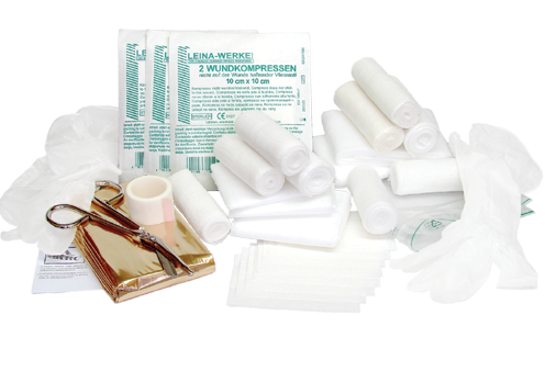 Wkład apteczny zawierający kompletne wyposażenie medyczne niezbędne do udzielania pierwszej pomocy.