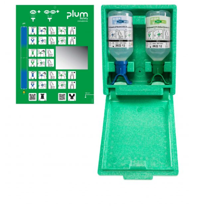 Stacja zamknięta PLUM CombiBox DUO zawiera zawiera butelkę 500 ml z płynem pH NEUTRAL DUO oraz butelkę 500 ml z płynem PLUM EYE WASH DUO w pudełku z polistyrenu zabezpieczającym przed kurzem.