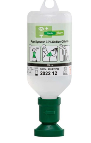 Butelka o pojemności 500ml może być elementem wyposażenia apteczek pierwszej pomocy lub służyć jako uzupełnienie stacji PLUM EYE WASH mocowanej do ściany