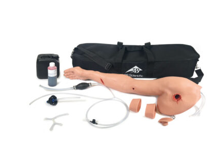 Trenażer do nauki tamowania krwotoku na kończynie górnej z realistyczną symulacją krwawień i ran. Symulator umożliwia trening m.in.: zakładania opaski uciskowej czy opatrywania rany za pomocą gazy zrolowanej lub opatrunku uciskowego.