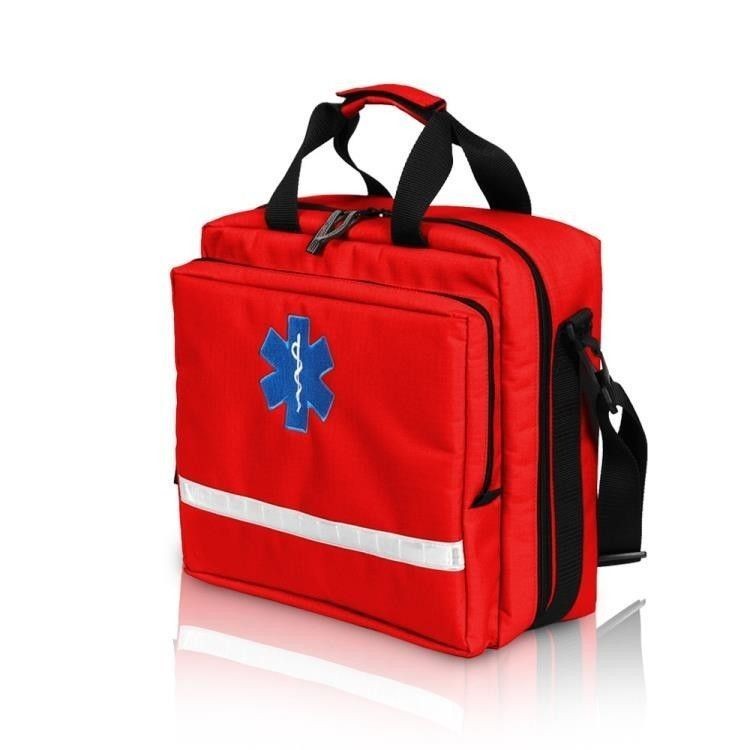 Duża torba medyczna dla pielęgniarek. Dostępne kolory: czarny, granatowy oraz czerwony. Obszerna, wygodna i pojemna torba lekarska dedykowana służbom medycznym. Jej zalety to: wygodny, szeroki i szybki dostęp do komory głównej, gdzie znajduje się duża kieszeń zapinana na rzep, liczne kieszonki z siatki zamykane na suwak. Zastosowanie siatki umożliwia łatwy przegląd zawartości torby. Cztery kodowane kolorami saszetki mocowane na rzep z przezroczystym wierzchem i opiankowanym spodem. Środek torby wykończony materiałem wodoodpornym WDP, bardzo łatwo zmywalnym. Z przodu torby duża zewnętrzna kieszeń z uchwytami z taśmy gumowej utrzymująca przedmioty o różnych gabarytach oraz kieszeń z siatki. Uchwyt ręczny i pas nośny na ramię odpinany. Użyte materiały: nici rdzeniowe COATS EPIC, materiał CODURA RIP-STOP wzmocniony dodatkowym, mocniejszym splotem, gwarantują niespotykaną dotąd odporność na przetarcia i rozerwania.