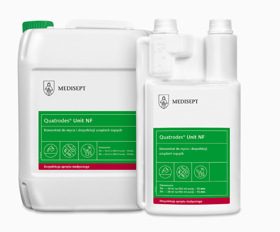 Zastosowanie: Quatrodes Unit NF przeznaczony jest do jednoczesnego mycia i dezynfekcji systemów ssących, separatorów amalgamatu i misek unitu stomatologicznego. Preparat nie pieni się. Przy codziennym stosowaniu zapobiega powstawaniu biofilmu. Może być stosowany również do dezynfekcji obiegu zamkniętego w wannach z hydromasażem będących wyrobami medycznymi. Produkt przeznaczony do zastosowania przez profesjonalnego użytkownika.