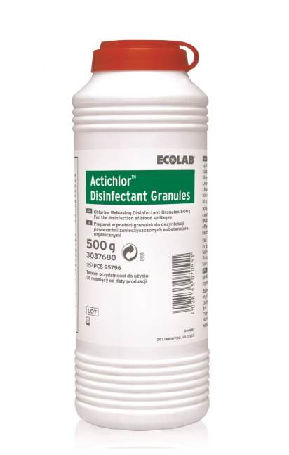 Preparatem Actichlor Granules należy zasypać skażone miejsce do całkowitego pokrycia zanieczyszczenia. Następnie należy pozostawić na min. 2 minuty. Po upływie czasu usunąć za pomocą ręczników jednorazowych lub szufelki. Następnie trzeba przeprowadzić dezynfekcję powierzchni z użyciem preparatu chlorowego (np. Medicarine, Actichlor Plus lub Actichlor Pine) i wytrzeć powierzchnię wilgotnym ręcznikiem jednorazowym. Wszystkie pozostałe odpady odpowiednio zabezpieczyć i przekazać do utylizacji.