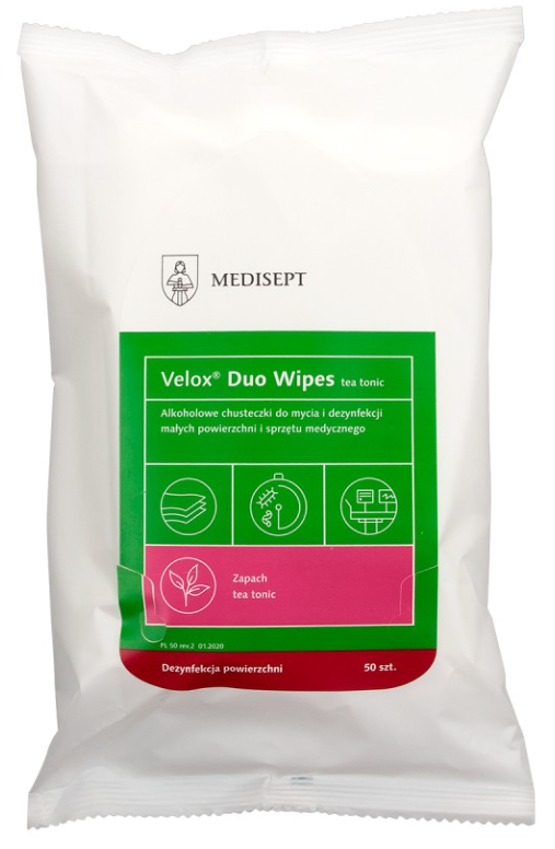 Medisept, chusteczki Velox Duo Wipes służą do mycia i dezynfekcji małych powierzchni i sprzętu medycznego. Mogą być stosowane wobec powierzchni mających kontakt z żywnością. Chusteczki są nasączone roztworem alkoholowym. Wykazują działanie wirusobójcze, grzybobójcze, bakteriobójcze, prątkobójcze