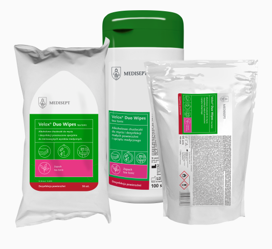 Velox® Duo Wipes to chusteczki do mycia i szybkiej dezynfekcji małych powierzchni w obszarze medycznym, domach opieki, sanatoriach, salonach fitness i SPA, salonach fryzjerskich, kosmetycznych, gabinetach masażu, przedszkolach, szkołach oraz do dezynfekcji powierzchni mających kontakt z żywnością. Zalecane do małych powierzchni sprzętu medycznego: łóżek i foteli zabiegowych, łóżek, aparatury medycznej i operacyjnej oraz do dezynfekcji końcówek stomatologicznych przed procesem sterylizacji oraz łyżek protetycznych i wycisków silikonowych. Dezynfekują powierzchnie zabijając w 30 sekund wirusy osłonkowe (w tym Vaccinia, BVDV, SARS-CoV-2, HIV, HBV, HCV) oraz rotawirusy i norowirusy, bakterie, grzyby drożdżopodobne oraz prątki gruźlicy.