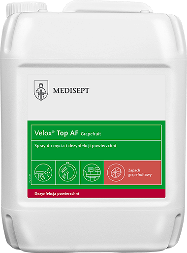 Velox Top AF to alkoholowy płyn do mycia i szybkiej dezynfekcji małych powierzchni (fotele zabiegowe, stoły operacyjne, aparatura medyczna oraz końcówki stomatologiczne przed procesem sterylizacji). Przeznaczony również do stosowania w gastronomii, domach opieki, sanatoriach, salonach fitness i SPA, salonach fryzjerskich, kosmetycznych, gabinetach masażu, przedszkolach, szkołach oraz do dezynfekcji powierzchni mających kontakt z żywnością. Idealnie nadaje się do mycia i dezynfekcji małych i trudno dostępnych powierzchni takich jak blaty, stoły, klamki, uchwyty oraz do sprzętu i akcesoriów fryzjerskich i kosmetycznych. Produkt posiada działanie bakteriobójcze, drożdżakobójcze, bójcze wobec prątków gruźlicy i ograniczone wirusobójcze. Działa na wirusy Rota i Adeno.