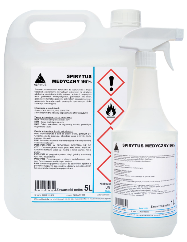 Spirytus medyczny 96% marki Alpinus Medica to wysokiej jakości alkohol etylowy przeznaczony do czyszczenia i dezynfekcji powierzchni odpornych na działanie alkoholu.