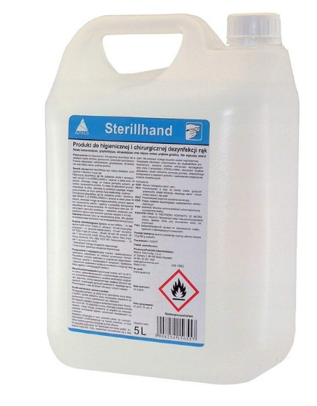 [Sterillhand 5l] – preparat w postaci płynu produkowany na bazie alkoholu etylowego o działaniu bakterio, grzybo, wiruso, prątkobójcze i bójcze wobec prątków gruźlicy, przeznaczony do higienicznej i chirurgicznej [dezynfakcji rąk].
