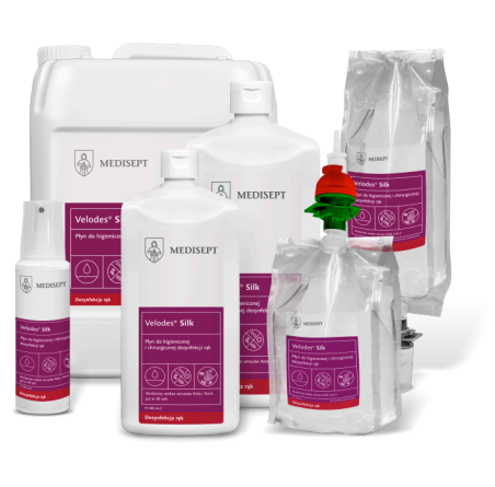 Velodes Silk to alkoholowy płyn do higienicznej i chirurgicznej dezynfekcji rąk w obszarze medycznym, żywnościowym, przemysłowym i domowym.