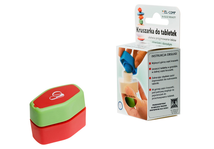 Kruszarka do tabletek umożliwia łatwe i szybkie rozdrabnianie tabletek, dzięki czemu ich zażywanie jest łatwiejsze zarówno dla dzieci jak i dorosłych. Szczególnie użyteczna dla osób z utrudnioną sprawnością połykania. Należy włożyć pastylkę do urządzenia i dokręcić wieczko (zakrętkę). Tabletka zostanie rozkruszona i roztarta na proszek. Ergonomiczny kształt i prosta obsługa sprawią, że sprzęt ten bez problemu może być używany przez osoby starsze. Kruszarka do leków posiada pojemniczek do przechowywania tabletek.